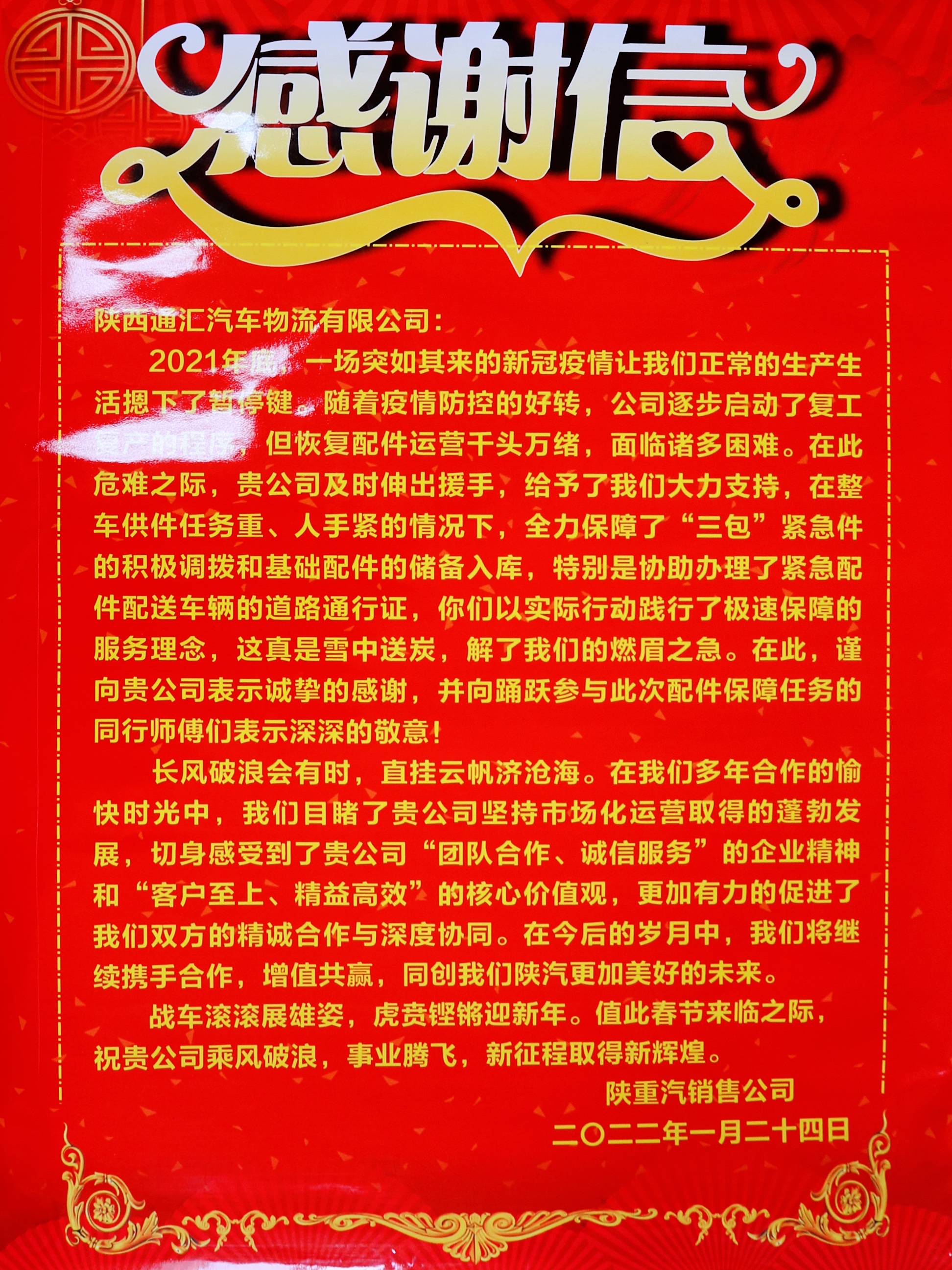 2022年1月29日,陕重汽销售公司党委副书记、副总经理魏炳亮,配件公司经理王建勇一行四人到访通汇物流,送来了一封感谢信和一面锦旗,并对复工复产期间,通汇物流全力保障“三包”紧急件的调拨和入库,特别是协助办理紧急配件配送车辆的道路通行证表示感谢。公司党总支书记、总经理童小齐携领班子成员接受锦旗,并于魏炳亮一行进行深入交谈。